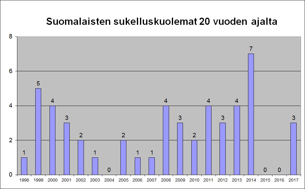 Kuvaaja laitesukelluskuolemista suomalaisille v.1998-2017: